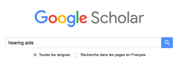 Pour commencer, voici l’image (Figure 1) de la barre de recherche de Google Scholar (somme toute classique). Pour le tuto, j’ai tapé le mot « hearing aids » ou aide auditive. La majorité des recherches se font en anglais mais elles peuvent se faire aussi en français. Néanmoins, le nombre de sources disponibles sera malheureusement plus faible.